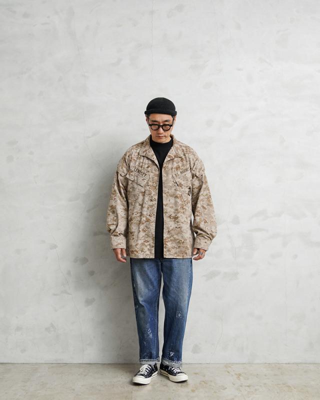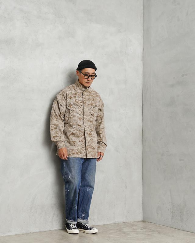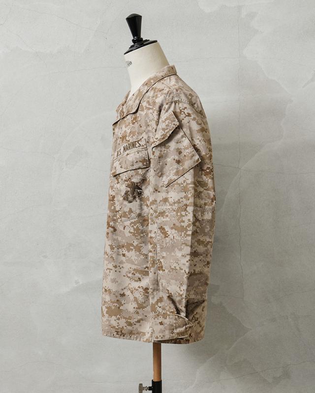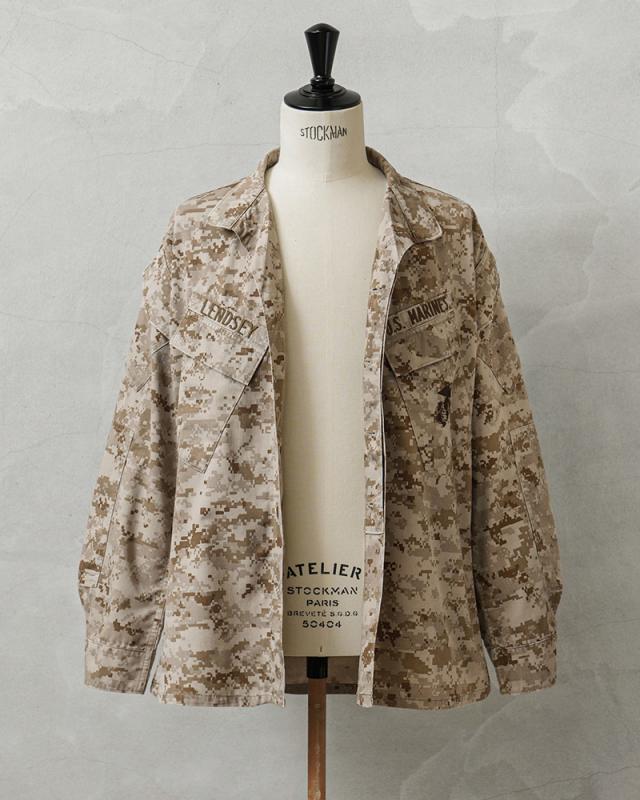 陸海空軍の全機能を備え、米軍が参加する主な戦いには最初に、上陸・空挺作戦などの任務で前線に投入される緊急展開部隊である米海兵隊(USMC)が使用するコンバットジャケットです。MCCUU(Marine Corps Combat Utility Uniform)は、2002年に配備が始まり現在も使用されるジャケットで、砂漠地帯での使用を目的に開発されたDESERT MARPAT(デザート マーパット)のカモフラージュパターンです。フロント開閉はボタン留めの比翼仕立てのデザイン、首元までボタンを閉じるとスタンドカラーで使用可能です。取り出しやすさを考慮した斜めに配置された胸ポケットと両袖にもボタン開閉のフラップポケットが付属しています。