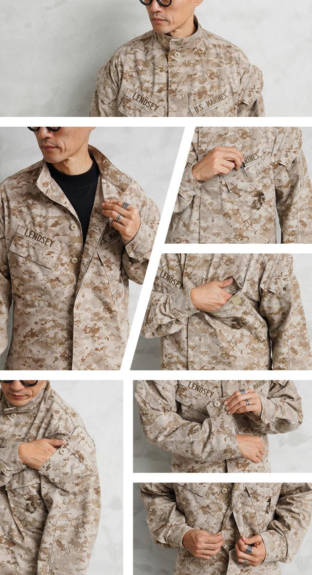 | 商品説明 | 実物 USED 米軍 USMC MCCUU コンバットジャケット DESERT MARPATのご紹介です。 制式名称:BLOUSE,DESERT MARPAT CAMOUFLAGE,MCCUU 陸海空軍の全機能を備え、米軍が参加する主な戦いには最初に、上陸・空挺作戦などの任務で前線に投入される緊急展開部隊である米海兵隊(USMC)が使用するコンバットジャケットです。 MCCUU(Marine Corps Combat Utility Uniform)は、2002年に配備が始まり現在も使用されるジャケットで、砂漠地帯での使用を目的に開発されたDESERT MARPAT(デザート マーパット)のカモフラージュパターンです。 フロント開閉はボタン留めの比翼仕立てのデザイン、首元までボタンを閉じるとスタンドカラーで使用可能です。取り出しやすさを考慮した斜めに配置された胸ポケットと両袖にもボタン開閉のフラップポケットが付属しています。胸ポケット上部には様々な名称のネームテープが付属しています。左胸には海兵隊を表すために使用されるエンブレムが刺繍されています。 袖口もボタンで調節が可能で、肘部分は二重に補強がされたデザインに加えて、内側からエルボーパッドが収納できるようにポケット状になっています。 水陸両用部隊であるUSMCが使用するシンプルな中に機能性が詰め込まれたコンバットジャケットです。 | |||||||||||||||||||||||||