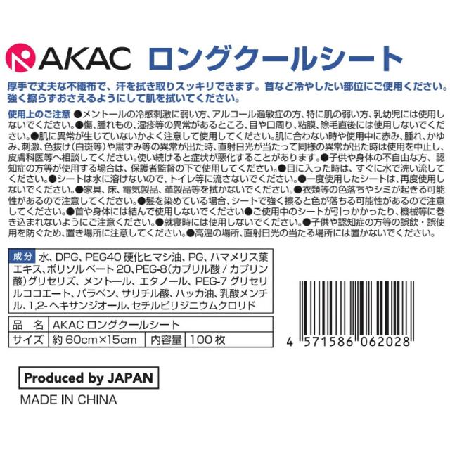 冷え冷え!なが〜〜〜い! 超大判サイズのロングクールシート。 熱く火照った身体にひんやり爽快♪ 厚手で丈夫な不織布で、汗を拭き取りスッキリできます。 首など冷やしたい部位にご使用ください。 たっぷり100枚入りの、みんなで使える大容量サイズです◎ スポーツや現場仕事などで大活躍間違いなし! ■シートサイズ:(約)60×15cm ■内容量:100枚 ■中国製 <使用上のご注意> ●メントールの冷感刺激に弱い方、アルコール過敏症の方、特に肌の弱い方、乳幼児には使用し ないでください。 ●傷、腫れもの、湿疹等の異常があるところ、目や口周り、粘膜、除毛直後には使用しないでください。 ●肌に異常が生じていないかよく注意して使用してください。肌に合わない時や使用中に赤み、腫れ、かゆみ、刺激、色抜け(白斑等)や黒ずみ等の異常が出た時、直射日光が当たって同様の異常が出た時は使用を中止し、皮膚科医等へ相談してください。使い続けると症状が悪化することがあります。 ●子供や身体の不自由な方、認知症の方等が使用する場合は、保護者監督の下で使用してください。 ●目に入った時は、すぐに水で洗い流してください。 ●シートは水に溶けないので、トイレ等に流さないでください。 ●一度使用したシートは、再度使用しないでください。 ●家具、床、電気製品、革製品等を拭かないでください。 ●衣類等の色落ちやシミが起きる可能 性があるので注意してください。 ●髪を染めている場合、シートで強く擦ると色が落ちる可能性があるので注意 してください。 ●首や身体には結んで使用しないでください。 ●ご使用中のシートが引っかかったり、機械等に巻き込まれないようにご注意ください。 ●就寝時には使用しないでください。 ●子供や認知症の方等の誤飲・誤使用を防ぐため、置き場所に注意してください。 ●高温の場所、直射日光の当たる場所には置かないでください。 【2412r】 |