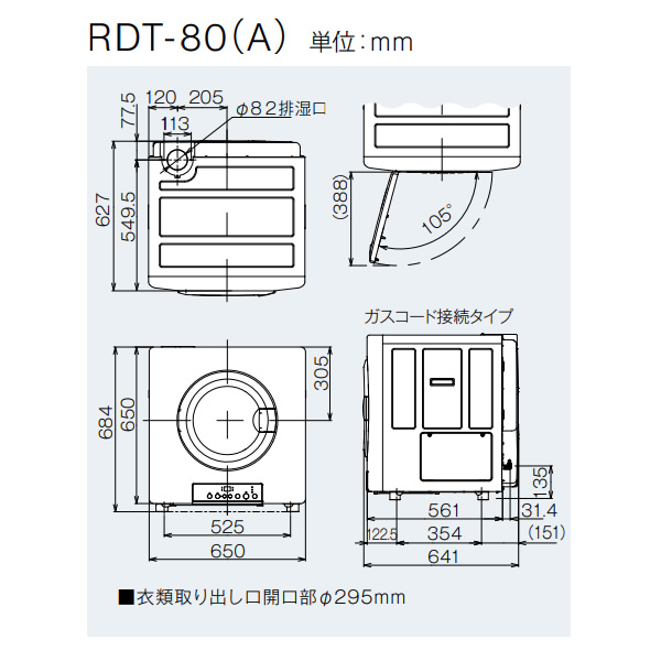 ガス衣類乾燥機「乾太くん」 STANDARD TYPE(スタンダード タイプ) 乾燥容量:8.0kg ■品名:RDT-80(A) ■ガス種類:都市ガス ■外形寸法: 高さ684×幅650×奥行641mm ■質量:33kg ■電源:AC100V(50/60Hz共用) ■乾燥容量:8kg ■ガス接続:小口径迅速継手付強化ガスホース(ガスコード) ■点火方式:連続スパークダイレクト点火 ■安全装置:過熱防止装置、不完全燃焼防止装置、立消え防止装置、排気温サーミスタ、吹出温サーミスタ、衣類温サーミスタ、漏電安全装置、ドアスイッチ、モーター過熱防止装置、ドラム回転検知、ファン回転検知、停電時安全装置、消し忘れ防止装置 ※記載は商品仕様の一部です。仕様説明不足等の理由での返品はできません。特に適合等は必ずご確認ください。