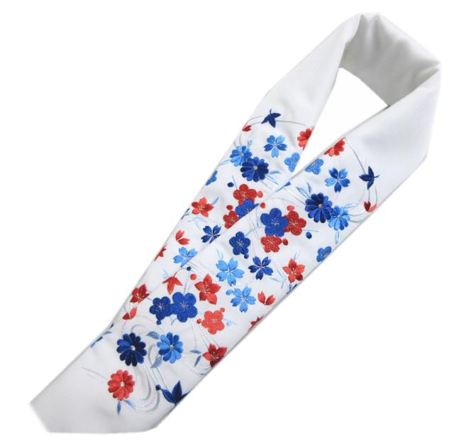 半衿 半襟 刺繍 銀糸入り 白色地青朱赤梅桜四季花ラメ流水 日本製 振袖 成人式 卒業式 袴 着物 女性用 レディース 振袖用 訪問着