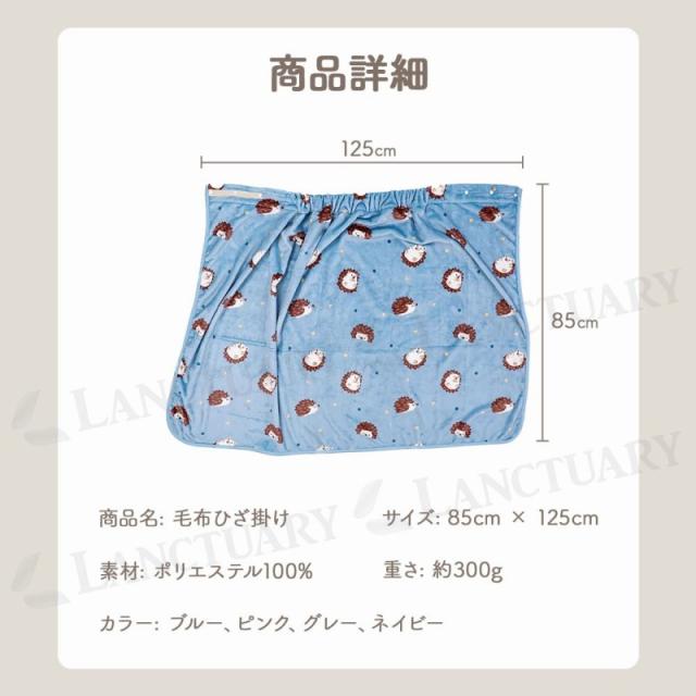 | 主な仕様 | 商品名: 毛布ひざ掛け カラー: ブルー、ピンク、グレー、ネイビー サイズ: 85cm × 125cm 重さ: 約300g 素材: ポリエステル |