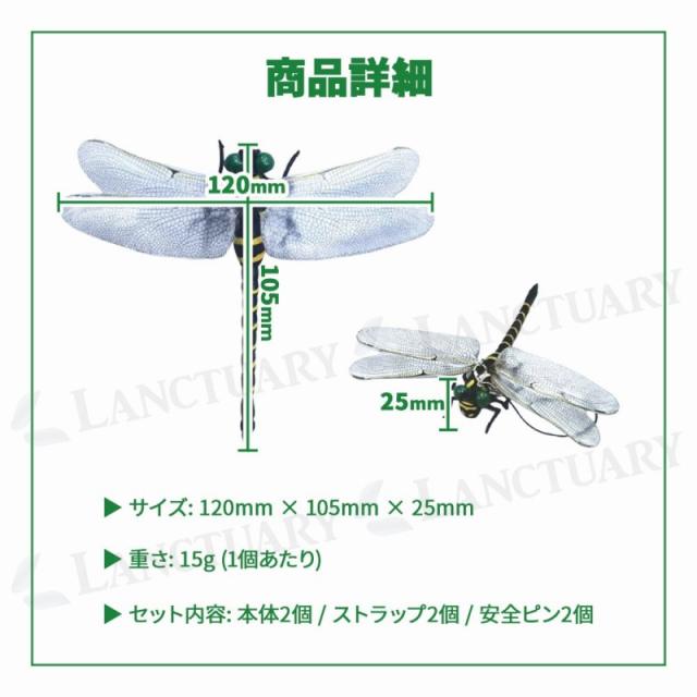 | 主な仕様 | 商品名: 虫よけオニヤンマ サイズ: 120mm × 105mm × 25mm 重さ: 15g セット内容: 本体 × 2 ストラップ ×2 安全ピン ×2 |