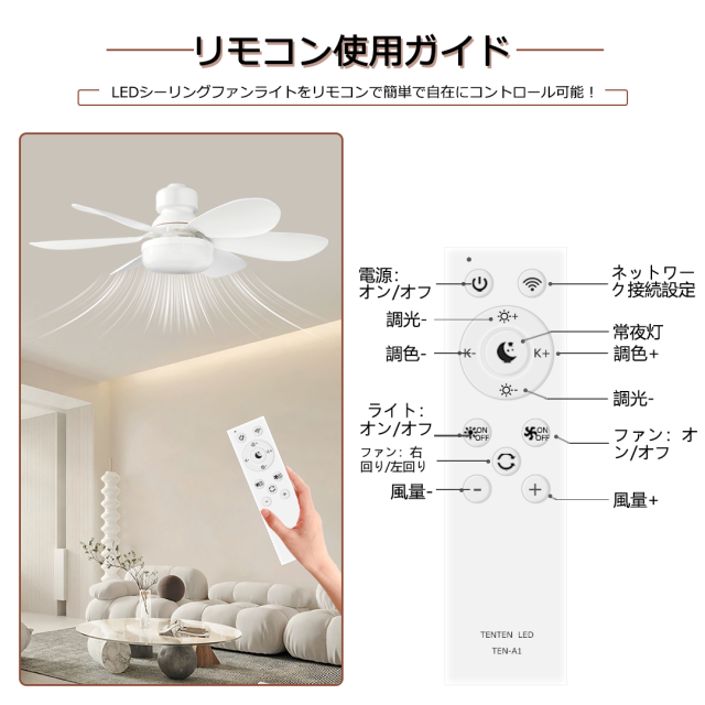 - 生活感が出ないスタイリッシュなデザインの多機能リモコン。照明やファンのON・OFFの他にも便利な機能を搭載。この1つでお好みに合わせて思いのままにコントロールができます。【搭載モード】風向き切替/色調切替/オフタイマー/風速切替/調光切替/ファンのオンオフ/照明オンオフ