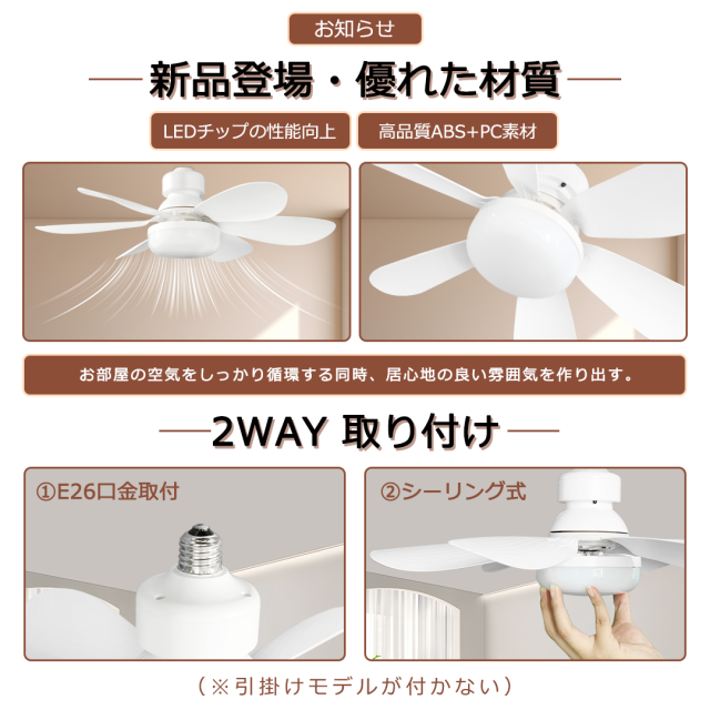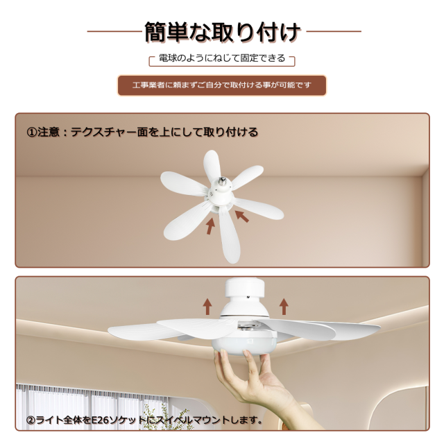 - 1 minかけてファンブレードのテクスチャ面を上にして本体に取り付けるだけで、ランプボディの取り付けが完了します。 次に2 minかけてライト全体をE26ソケットにスイベルマウントします。工事業者に頼まずご自分で取付ける事が可能です。ニーズに応じて角形や丸型引掛シーリングなど多種E26種類の埋め込みローゼットや引掛けシーリングを選べ、本体をそのまま取り付けることが可能になりました。