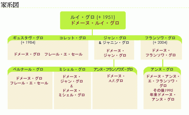 Michel GROS / ミシェル・グロ 1830年から続くヴォーヌ・ロマネの名門中の名門グロ一族 ドメーヌ・ミシェル・グロは、コート・ド・ニュイの心臓部ヴォーヌ・ロマネ村に所在し、その起源は1830年、グロ家の一人がこの村に定住してドメーヌを構えたことに遡ります。後継者たちは代々ブドウ畑の入手に勤め、現在の栽培面積は23ヘクタールに達します。 中でも貴重なのはヴォーヌ・ロマネ・プルミエクリュ《クロ・デ・レア》で、1860年にグロ家がこの畑を購入して以来、今日までずっと単独所有(モノポール)でワイン造りを続けています。現在はピエール・グロがこの歴史あるヴィニュロンの家系の7代目当主となり、父ミシェルとともに先代たちから受け継いだ家業を発展させています。 ヴォーヌ・ロマネにおけるかつての大ドメーヌ、ジャン・グロは、96年に3人の子供への相続が完了。リシュブールを妹のアンヌ・フランソワーズに譲る代わり、ジャン・グロの看板となるモノポール畑、ヴォーヌ・ロマネ1級クロ・デ・レア2.12haを継承したのが長男のミシェル・グロ。また、ジャン・グロのラベルが消滅するはるか以前から、実質的にジャン・グロのワインを造っていたのもミシェル・グロである。 あらためてグロ家の家系について述べれば、ジャン・グロにはほかに3人の兄弟がおり、兄のギュスターヴと妹のコレットはグロ・フレール・エ・スールを創設。このふたりには子供がなかったため、ジャンの次男、つまりミシェルの弟であるベルナールが跡を継いだ。 ジャンの弟のフランソワはドメーヌ・フランソワ・グロを立ち上げ、娘のアンヌが成長するとドメーヌ・アンヌ・エ・フランソワ・グロに改名。95年以降、ドメーヌ・アンヌ・グロとして継承された。 ミシェルの妹、アンヌ・フランソワーズはポマールのフランソワ・パランに嫁ぎ、ジャン・グロの生前贈与が始まった1988年にドメーヌ・A-F・グロを創設。ワインを醸造しているのは夫のフランソワ・パランである。このように現在、グロを名乗るドメーヌは全部で4つ存在する。 ドメーヌ・ミシェル・グロはヴォーヌ・ロマネ、ニュイ・サン・ジョルジュ、シャンボール・ミュジニーに畑を所有。特級畑としてはクロ・ヴージョの最上部に0.2haの区画を所有する。ただし、もっとも広い畑はブルゴーニュ・オート・コート・ド・ニュイで、その面積は10haを超える。これはジャン・グロとは別にミシェル・グロが若い時からコツコツと広げた区画である。 ミシェル・グロのワインは濃いめの色調をもち、果実味が前面に出て、オークの香ばしいフレーバーが豊かに香るタイプ。しかしながら、アペラシオンごとのテロワールはそのテクスチャーの中にきちんと表現され、ニュイは力強く、ヴォーヌは気品があり、シャンボールはシルキーである。 また生産量の多いオート・コートは、価格の割りに質が高く、ラインナップの中でもとくにお値打ちの1本といえよう。