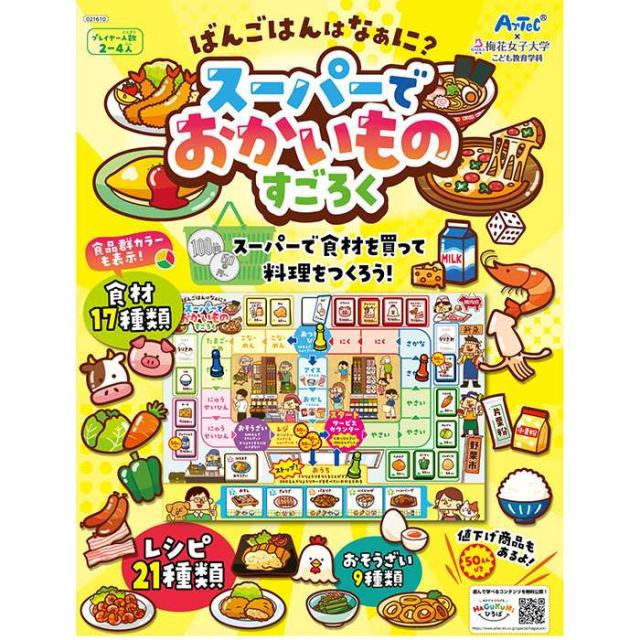 お金を払って食材を入手し、料理を完成させるすごろくです。食材は3色食品群に基づいて色分けされており、食育にも最適です。お金を払って、商品とおつりをもらう練習もできます。梅花女子大学こども教育学科とアーテックとの産学連携によるコラボ商品です。2〜4人用。