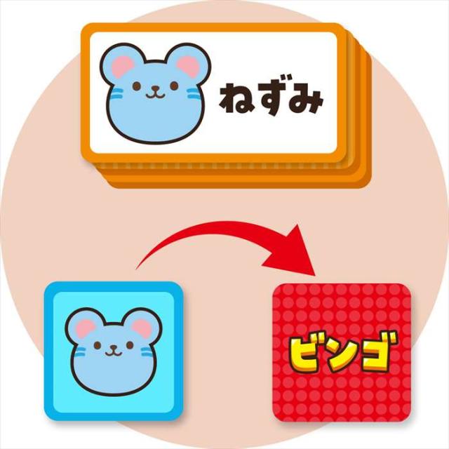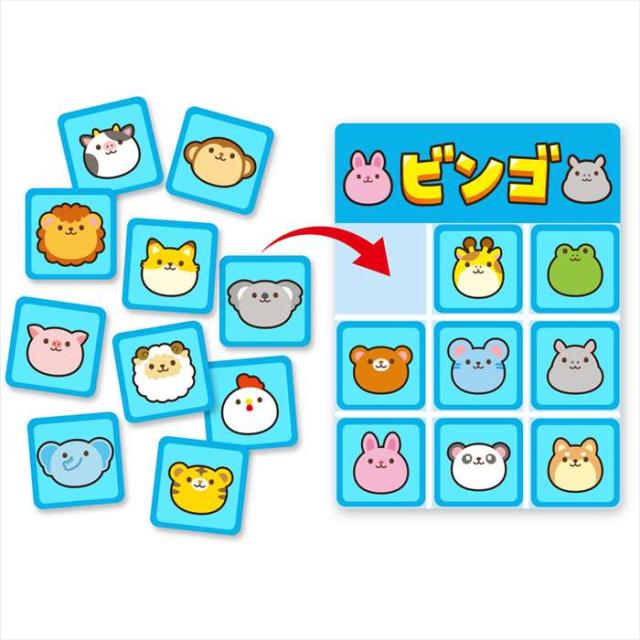 18種類のどうぶつカードを使うカードゲームです。かわいいイラストで、数字が読めない小さなお子様でも楽しめるビンゴです。好きなどうぶつカードを選んでシートに並べ、山札をめくって出た動物がシートにある場合は裏返してビンゴカードを得られます。たて・よこ・ななめにビンゴカードが並んだらビンゴです。また、どうぶつカード72枚を裏返して並べ、絵合わせ(神経衰弱)をすることもできます。2〜4人用。