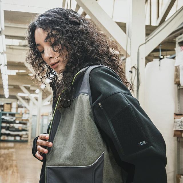 反射材のパイピングにより暗所での視認性も考慮したデザインの防寒べスト