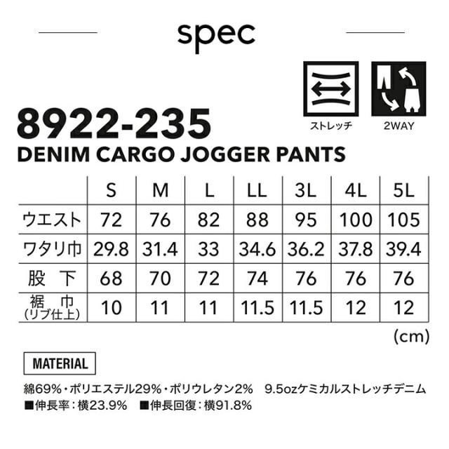 寅壱 デニムカーゴジョガーパンツ 8922-235 秋冬 作業服 作業着 ズボン カーゴパンツ ジーパン ストレッチ かっこいい トライチ