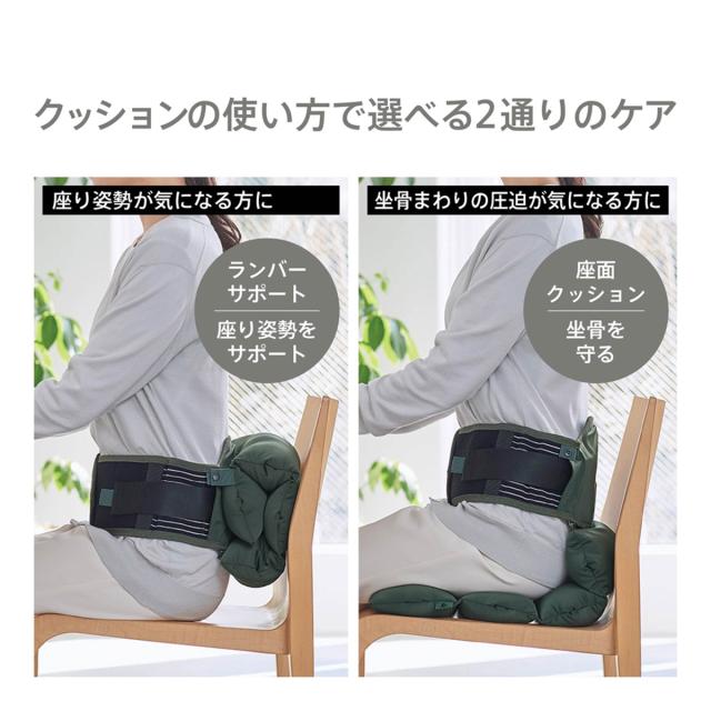 「クッションコルセット」はランバーサポートスタイル・座面クッションスタイルの2通りからお悩みに合わせてクッションの使い方を選び、座り姿勢をケアできます。