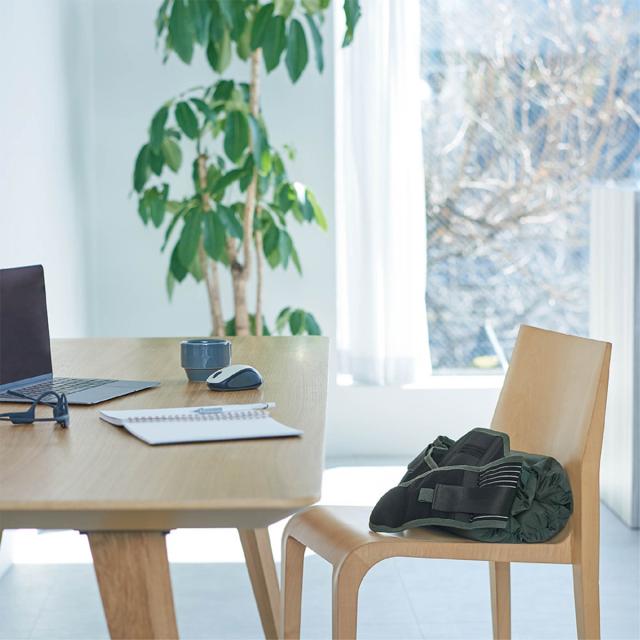 クッションを丸めてスナップボタンで留めると、腰のS字カーブに優しくフィットします。直接腰に装着しているので、より姿勢を保ちやすいです。