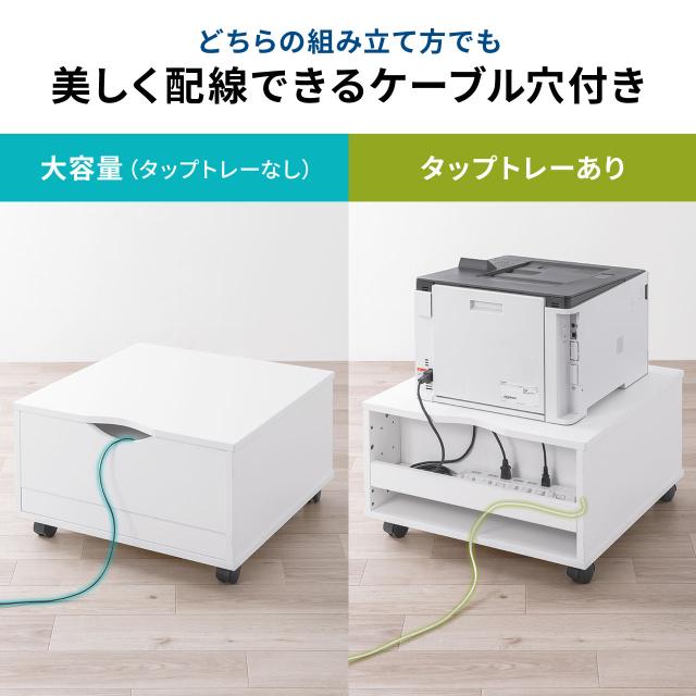 ●プリンターを設置しやすい、ボックス方のプリンター台です。●タップ収納ありの設定、中を広く使う設定と組立時に設定ができます。