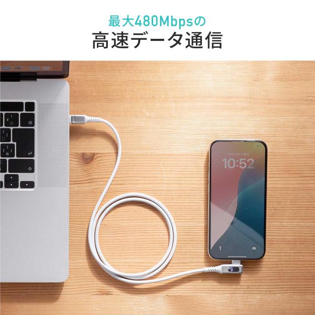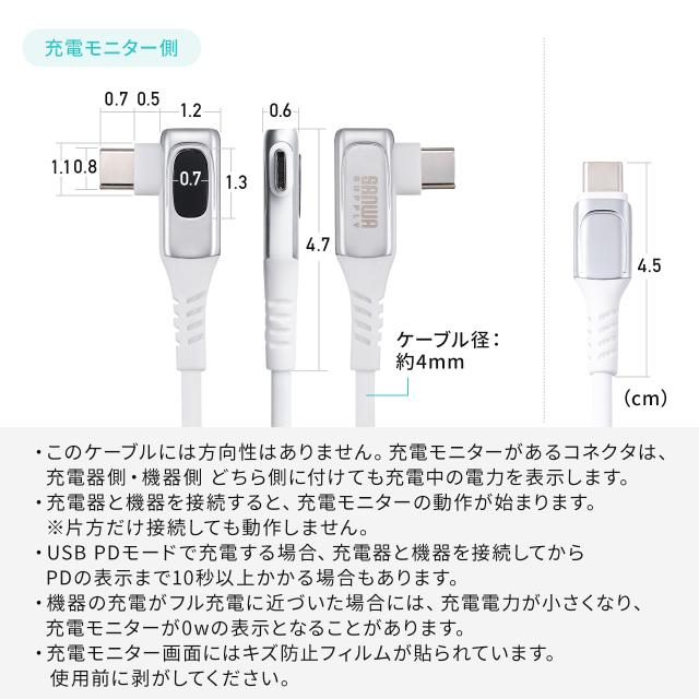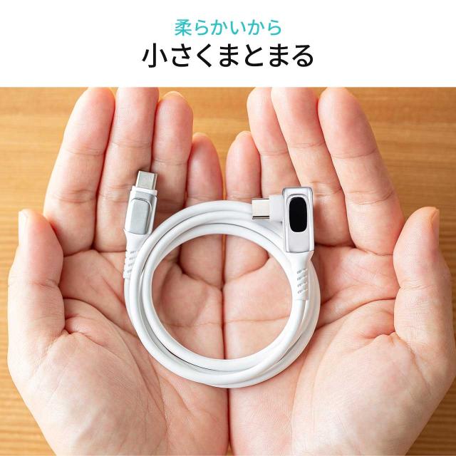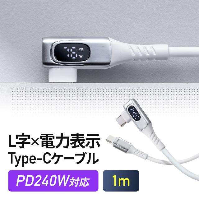 USB Type-Cケーブル W数表示機能付き L字コネクタ PD240W対応 やわらかシリコンケーブル USB2.0 iPhone16 1m ホワイト[500-USB078L-1]