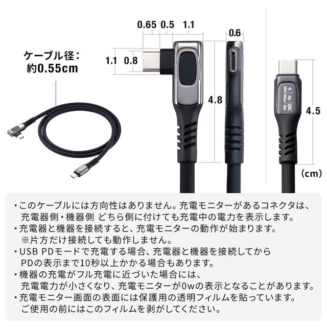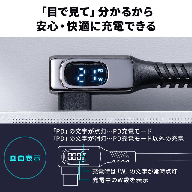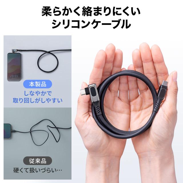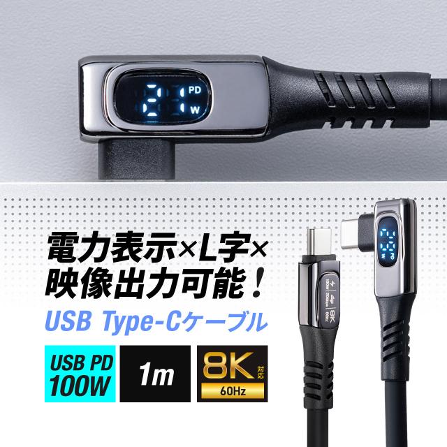 USB Type-Cケーブル W数表示機能付き USB4.0 8K/60Hz L字コネクタ 映像伝達可能 PD100W対応 1m シリコンケーブル 充電 データ転送 スマホ タブレット [500-USB087L-1]