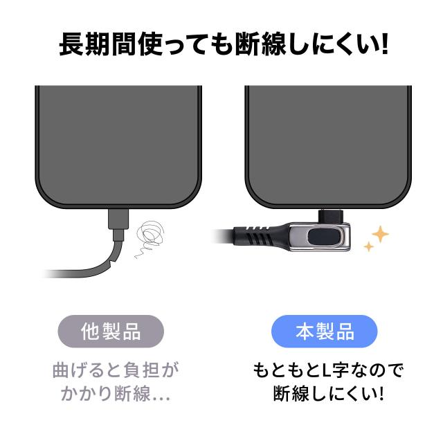 ●L型コネクタを採用し、配線がスッキリとして邪魔になりにくいため、デスク周りや車内など、狭いスペースでの利用に最適です。●充電状況がわかるLED表示機能付きのため、充電時の電力量が分かります。