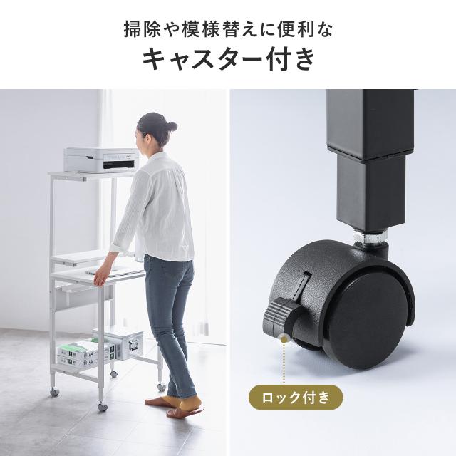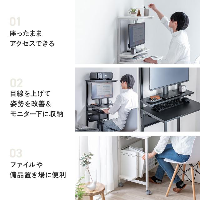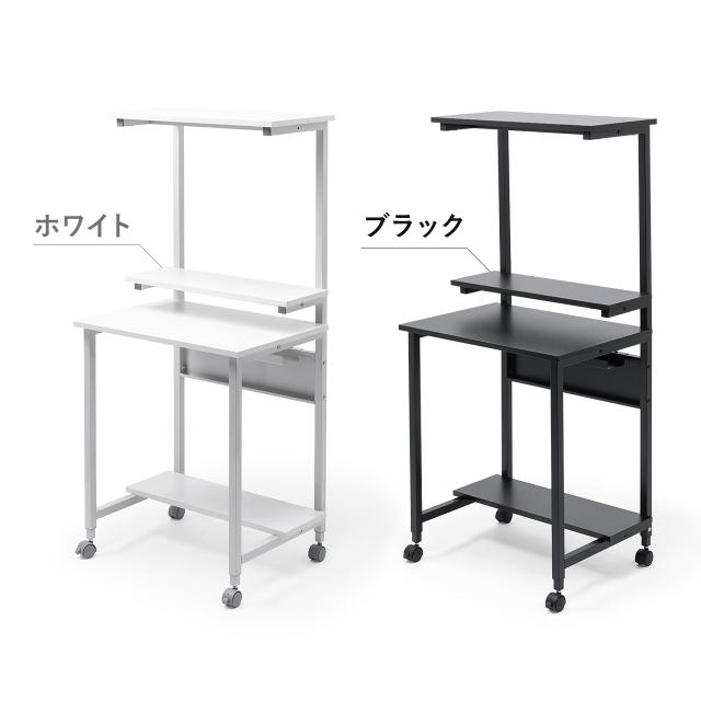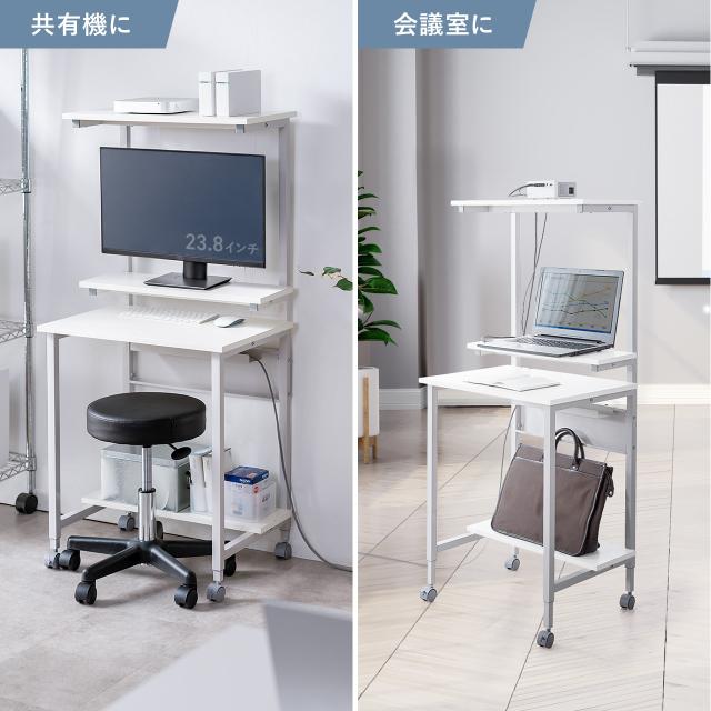 パソコンデスク パソコンラック ワークデスク コンパクト 棚板3枚 収納 シンプルデスク オフィス 会議室 キャスター付き 横幅約60cm 総耐荷重最大46kg サブテーブル付 ブラック ホワイト[100-DESKF061]