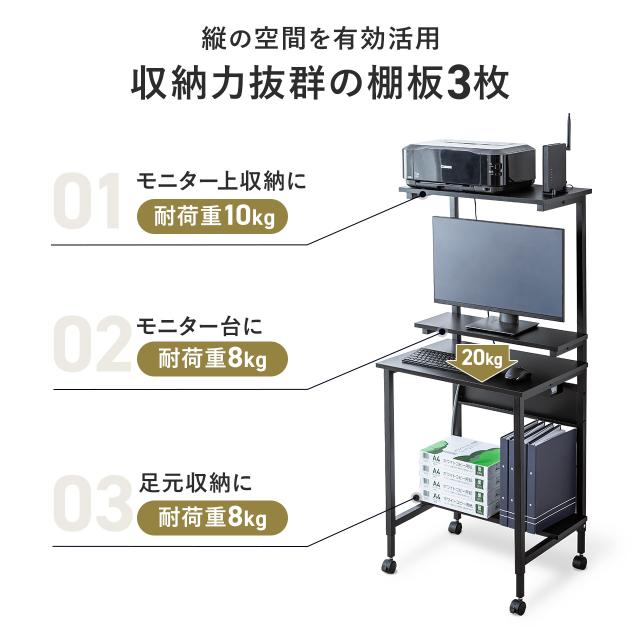 ⇒ご購入の前にご確認下さい棚板が 3枚付いており、コンパクトなのに収納力があるパソコンラック。キャスターがついているため、自由に場所を動かして使うことができる。高さも4段階変更可能。【WEB限定商品】