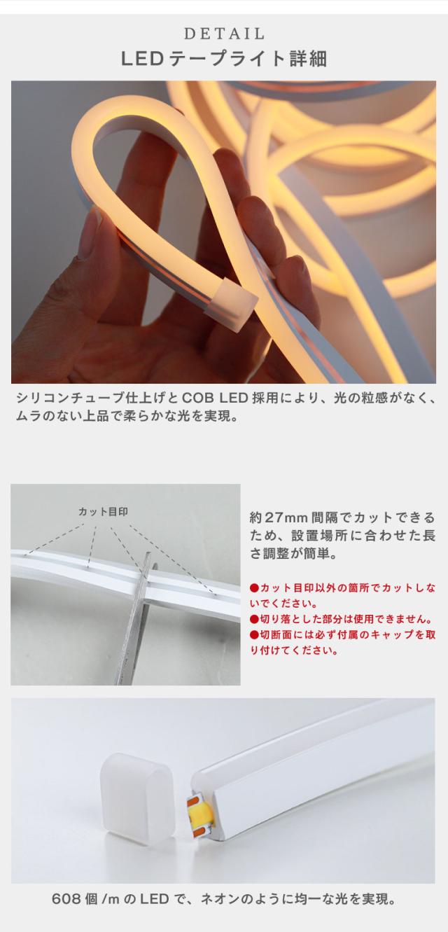 | 使用上の注意 | ●リモコンで消灯する際、若干のタイムラグが生じることがありますが、仕様上であり、不具合ではありません。 ●使用時には必ず付属のACアダプターをご使用ください。※3mと5m用のACアダプターは仕様が異なりますのでACアダプターを差し替えて使用しないでください。 ●使用中は本体やACアダプターが熱くなります。放熱されやすく空気の流れがよい場所に設置してください。また何重にも巻いたり、無理に曲げると熱が溜まり熱くなりますので、本体は緩く巻いたり、直線状に設置して放熱しやすい状態でご使用ください。 ●非常灯用としては使用しないでください。 ●静電気に注意してください。故障の原因になります。 ●天井や軒裏への埋め込み設置を対象としていません。 ●こちらの製品はアプリや音声では操作できません。付属の専用リモコンで操作をおこなってください。 ●電圧変動によりチラつくことがありますが故障ではありません。 ●LED素子には光色、明るさにバラつきがあるため、同じ商品であっても色や明るさが異なる場合があります。 ●テープライト本体には両面粘着テープが付属していません。棚下などに固定する際は、別途粘着テープなどをご用意ください。 ●シリコンチューブ部分は、日常生活防水程度の保護構造となっておりますが、完全防水ではありません。水中での使用や大量の水がかかる環境では使用しないでください。 その他取扱説明書をよくお読みの上ご使用ください。 |