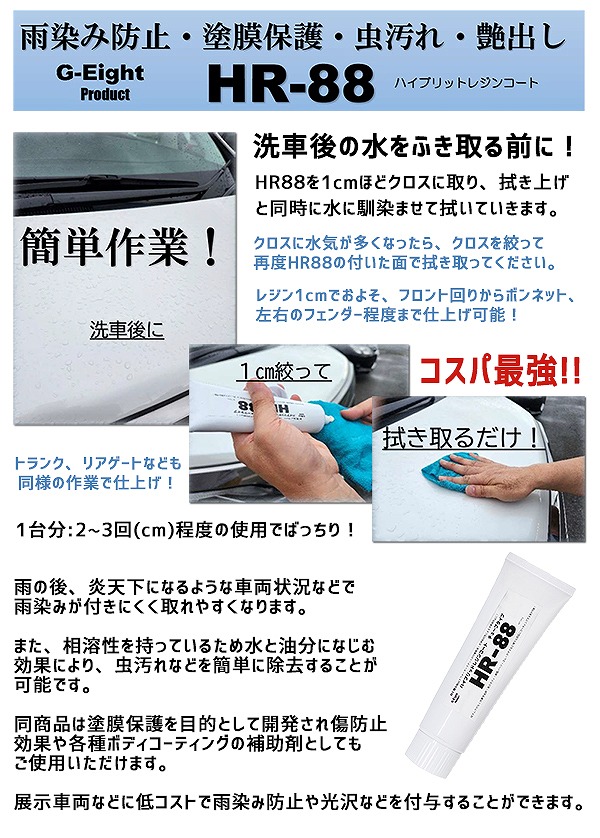 雨染み防止・塗膜保護・虫汚れ・艶出し 簡単コーティング&コスパ最強! HR88は、洗車後に水を拭き取るクロスなどに塗布し、水を吸い取りながら全体へ伸ばすことでムラなくコーティングすることができる相溶性の塗膜保護剤です。 ●ハイブリッド レジン コートの特長●相溶性に優れ水や油分に良く馴染む特性を持っており、コンパウンド磨き後やワックス分が付着しているボディに強く定着します。 水洗後の濡れたボディの水分と混ざることにより、水がコーティング液となり拭き上げ作業と同時にコーティングすることが可能です。 【内容量】1本 100g 【用途】ガラス系コーティング被膜の保護剤、磨き後の塗膜保護コーティング、洗車傷防止保護コーティング、ウォータースポット付着防止(車体塗装面、ゴム部品、プラスチック部品、メッキ部品、ガラス部) 【付帯機能】黒味復活、撥水効果、傷隠し、艶出し 【1本使用目安】ワンボックスカー約3台/普通車約6〜7台 【PPおよびウレタンパーツの黒味復活】 白くなってしまったウレタンパーツなど黒味を出す場合は、少量の水で伸ばし塗り込んでください。程度により2〜3回程度重ねて塗り込むことでよりムラなく仕上がります。※車両の状態により異なりますので仕上がりを保証するものではありません。 【ご 注 意】 ※納品後の交換は、ご注文品番以外のものが届いた場合を除き、交換・返品などはお受けいたしかねます。 ※メーカー在庫の為お急ぎの場合は、納期の確認をお願い致します。 通常2〜3日(土・日・祝日を除く)で発送となります。 メーカー欠品の場合(2〜3週間)は、その旨連絡致します。 お急ぎの方は、必ずご注文前に在庫の確認を御願い致します。