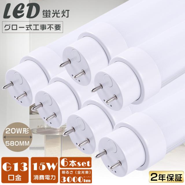 レビュー特典・6本入り 直管LEDランプ G13口金 LED蛍光灯 直管 20型 LED直管蛍光灯 20W型 LED蛍光灯 20W形 直管 グロー式 20型蛍光灯 LED 照明 グロー 工事不要 20W 消費電力15W 高輝度3000LM LED蛍光管20型 20形 天井照明 580MM FL20ss ベースライト LED エコ 水銀ゼロ 店舗