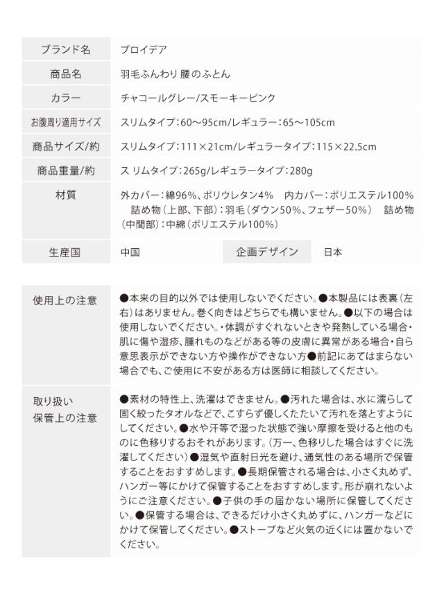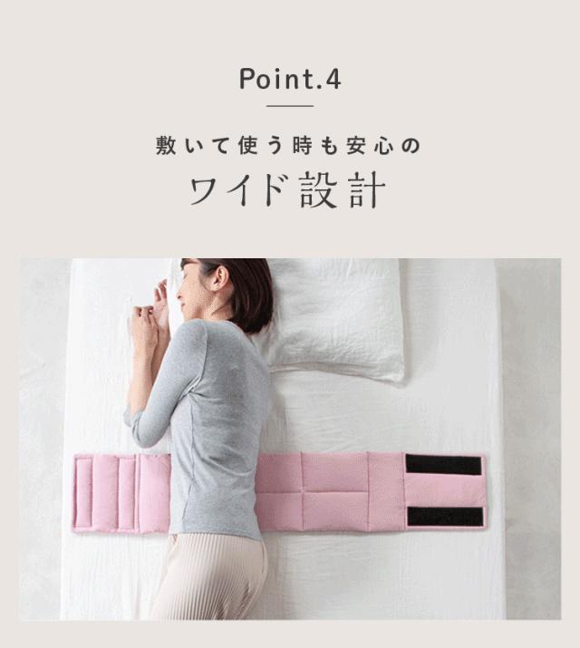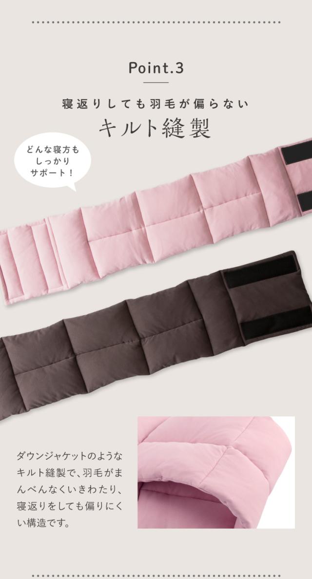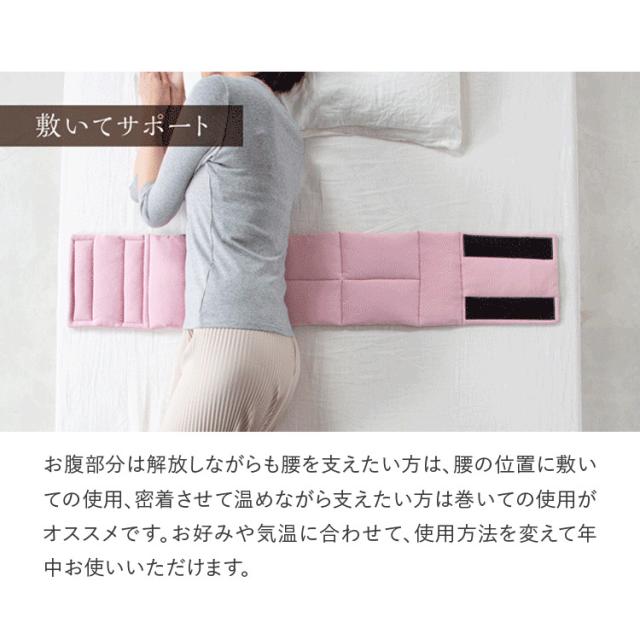 就寝時の腰のカーブのさぽーとはもちろん、冬場の寒さや夏のクーラーから腰とお腹を守るため、羽毛を贅沢に使用。腹巻としても使用できます。