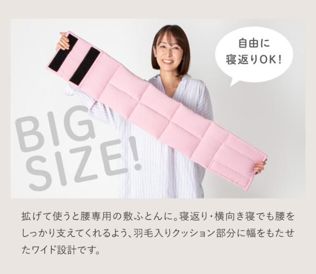 広げて使うと腰専用の敷布団に。寝返り・横向き寝でも腰をしっかり支えてくれるよう、羽毛入りクッション部分に幅を持たせたワイド設計です。