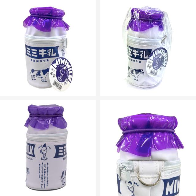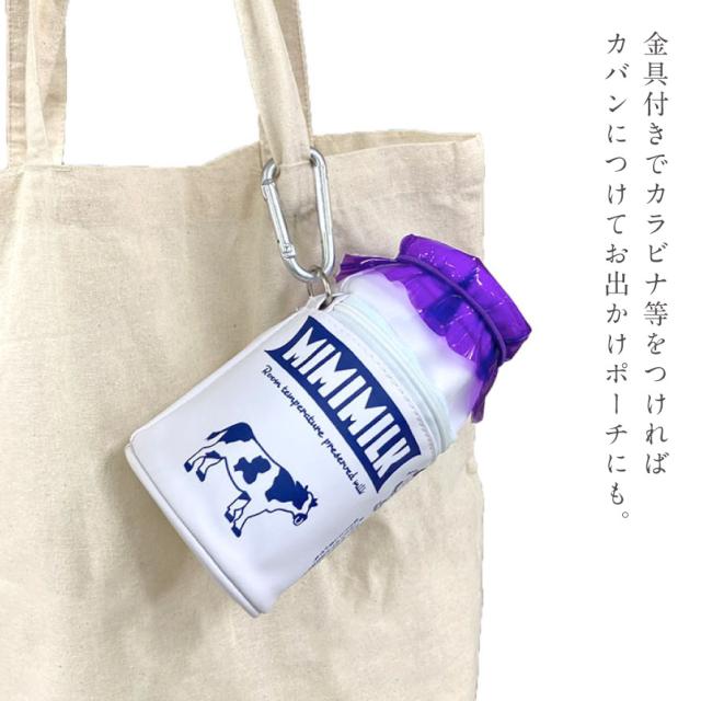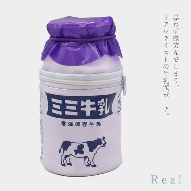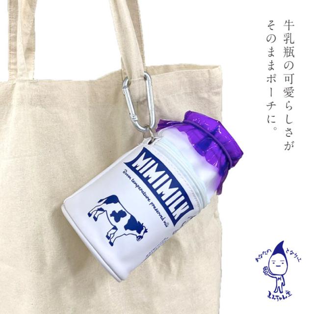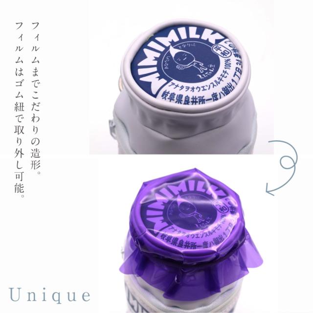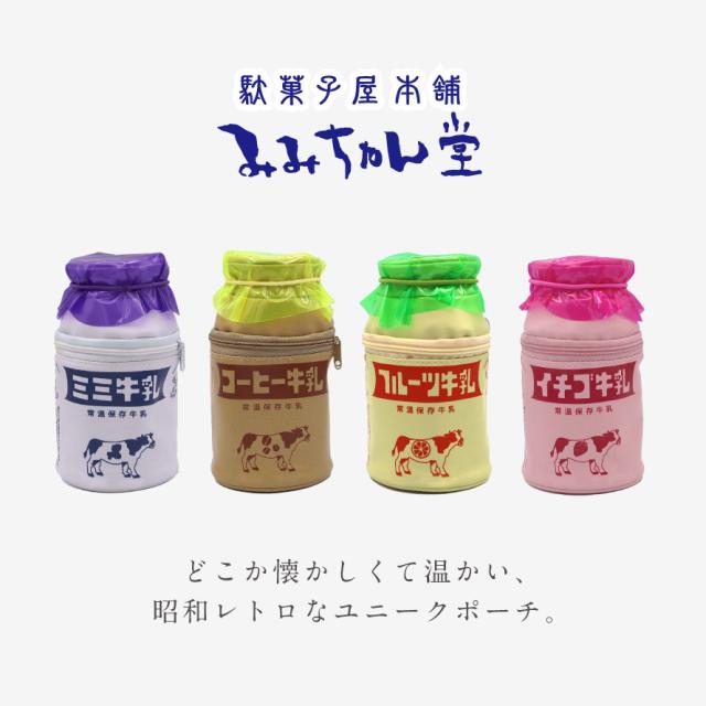 牛乳瓶の可愛らしさがそのままポーチに。蓋もフィルムもリアルに表現したユニークなポーチ。ロゴや牛のイラストにも温もりを感じる、どこか懐かしい昭和レトロな「みみちゃん堂」のデザイン。