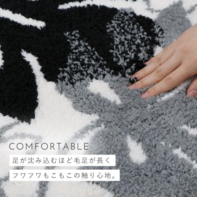 モノクロ&植物柄が落ち着いた印象。極上のふかふか足元マット。毛足の長いマイクロファイバー糸を高密度に敷き詰め、足が沈み込むほど豊かなボリューム。フワフワもこもこの触り心地。足をふんわり温めます。ソフトで優しい肌触りのポリエステル生地。