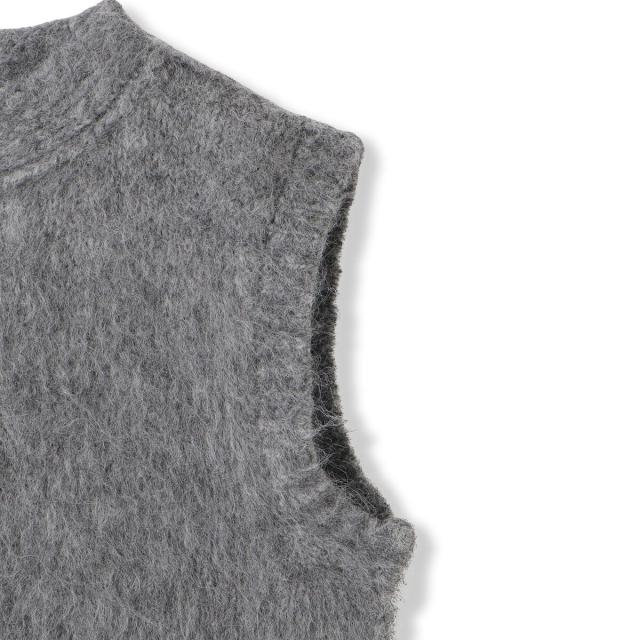 ふわふわとした毛足の長いフェザーヤーンがキャッチーなニットベスト。