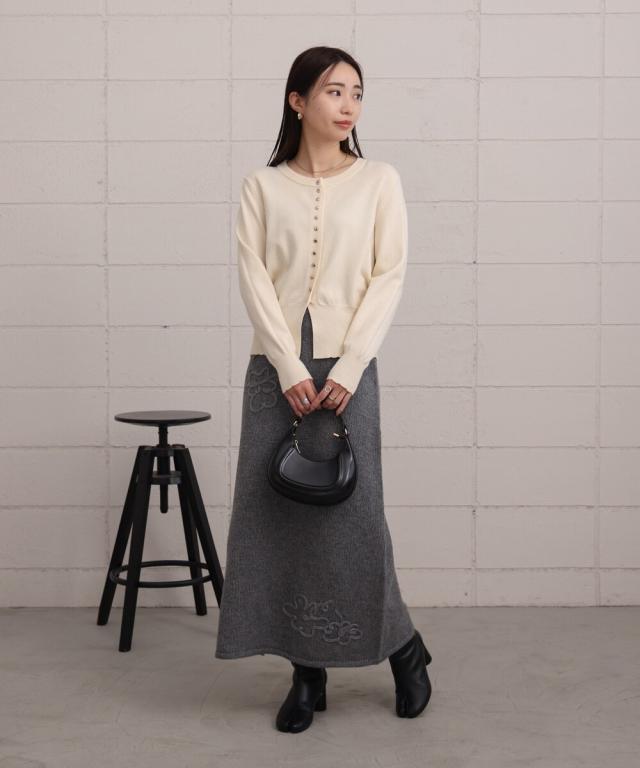 今年話題のスリットヘムトップスで上品なエレガントスタイルからリブニットをオンしたラフな着こなしまで、フェミニンなコーディネートの幅を広げてくれる優秀スカート!刺繍部分も程よいサイズで華美になり過ぎないので、オフィスカジュアルにも活躍してくれます。