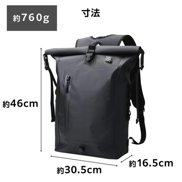 | 外形寸法:W約305mm×D約165mm×H約460mm ※ハンドル・ショルダーベルト部含まず ポケット(前面):止水ファスナーポケット×1 カラー:ブラック 材質:500D PVC ターポリン生地 重量:約760g 容量:約22L その他:エアーキャップ付き その他:排水バルブ付き |