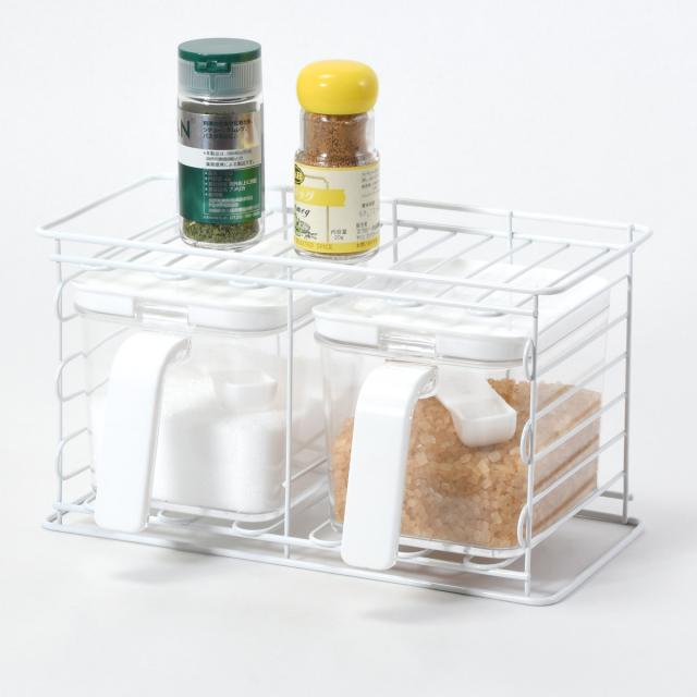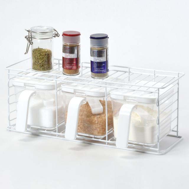 毎日のお料理に欠かせない調味料をスッキリと収納できる、調味料ストッカー3個と専用ラックのセットです。ストッカーには料理によく使う砂糖や塩などを保存でき、ラックの上段にはスパイス類を置いていただけます。