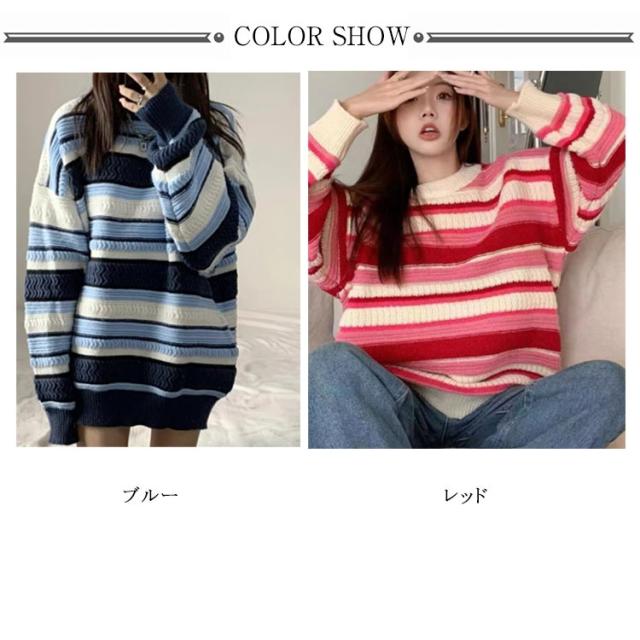 ニット レディース セーター ボーダー柄 ニットトップス プルオーバー 長袖 クルーネック 大きいサイズ オーバーサイズ ゆったり ボーダー配色 おしゃれ かわいい カジュアル 通勤 秋 冬 送料無料