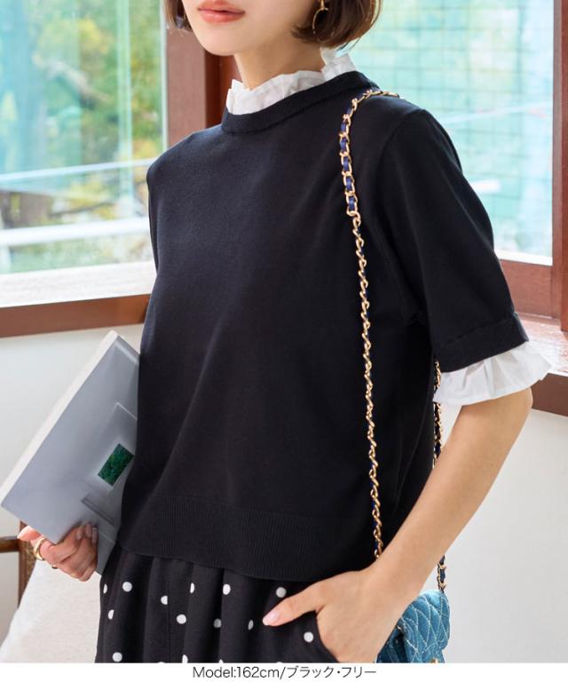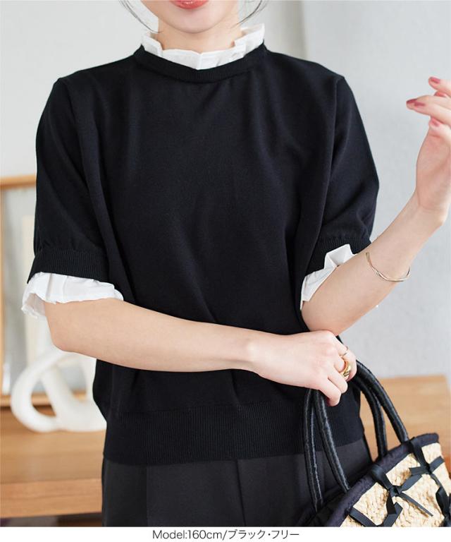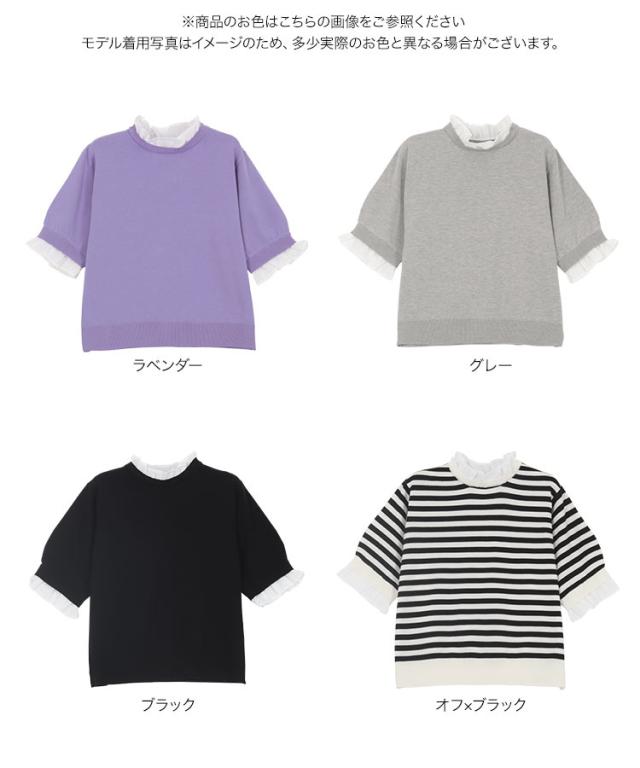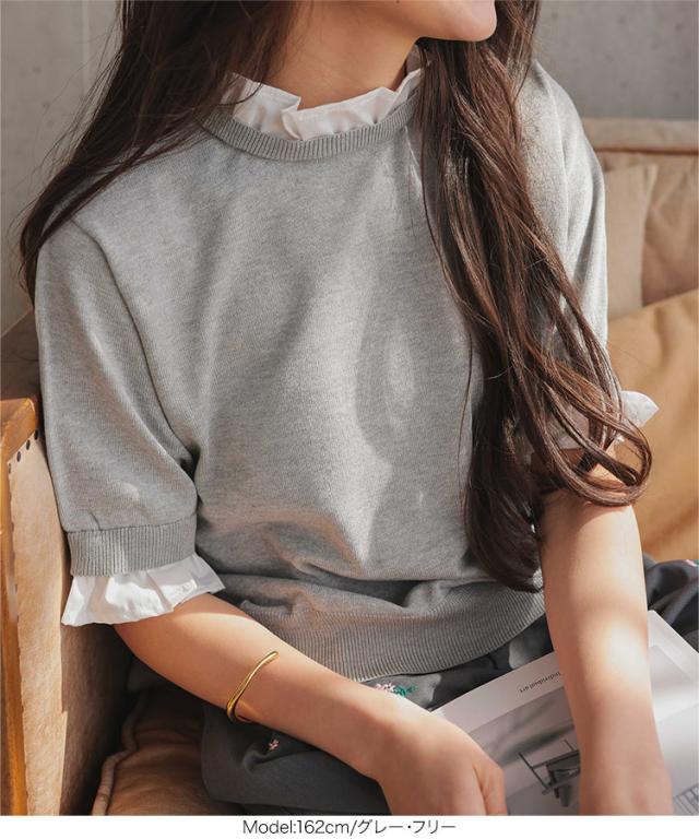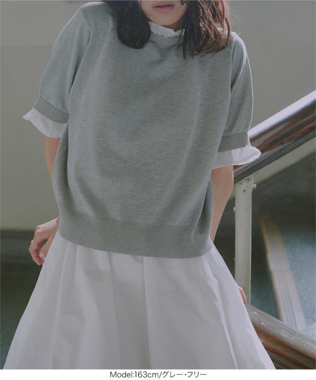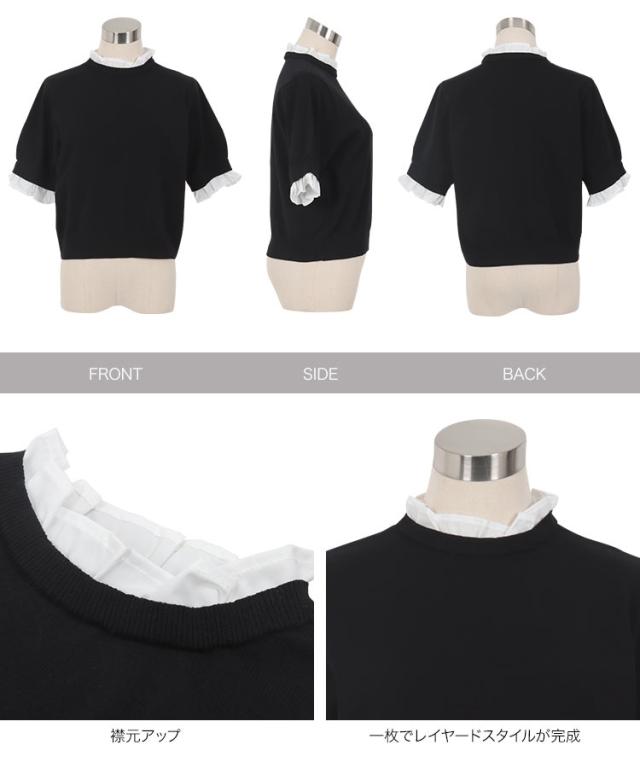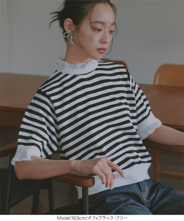 シャツレイヤード風サマーニットトップス C7411 入荷済 レディース 20代 30代 40代 ニット ボーダー 半袖 セーター シャツ ブラウス スタンドカラー フリル ギャザー レイヤード サマーニット 重ね着