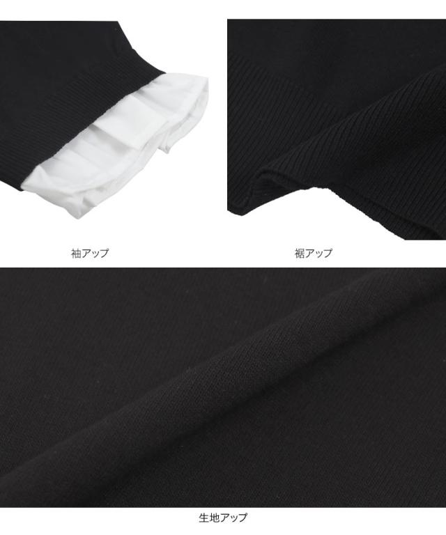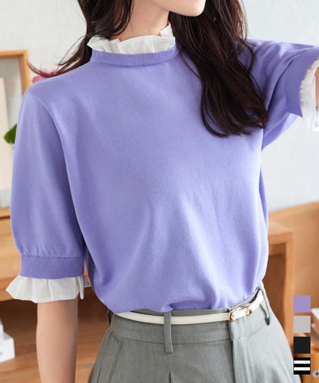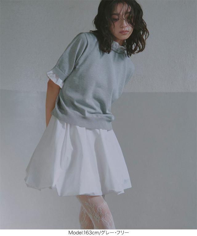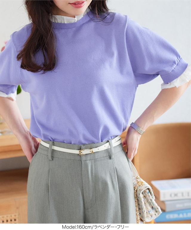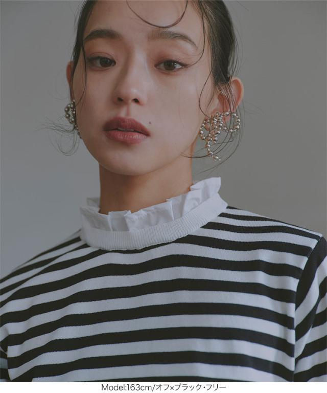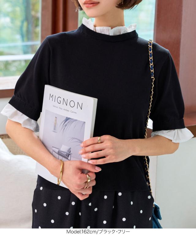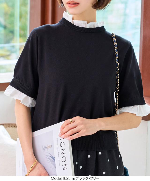 シャツレイヤード風サマーニットトップス C7411 入荷済 レディース 20代 30代 40代 ニット ボーダー 半袖 セーター シャツ ブラウス スタンドカラー フリル ギャザー レイヤード サマーニット 重ね着