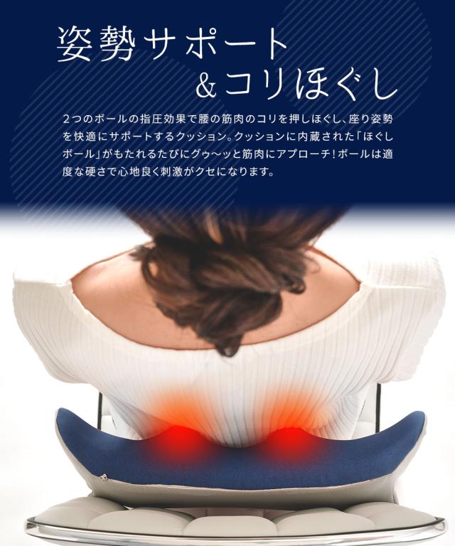2つのボールの指圧効果で腰の筋肉のコリを押しほぐし、座り姿勢を快適にサポートするクッション