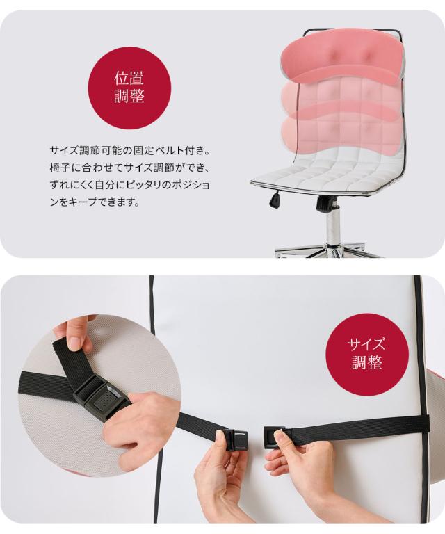 椅子に合わせてサイズ調節ができ、ずれにくく自分にピッタリのポジションをキープできます。