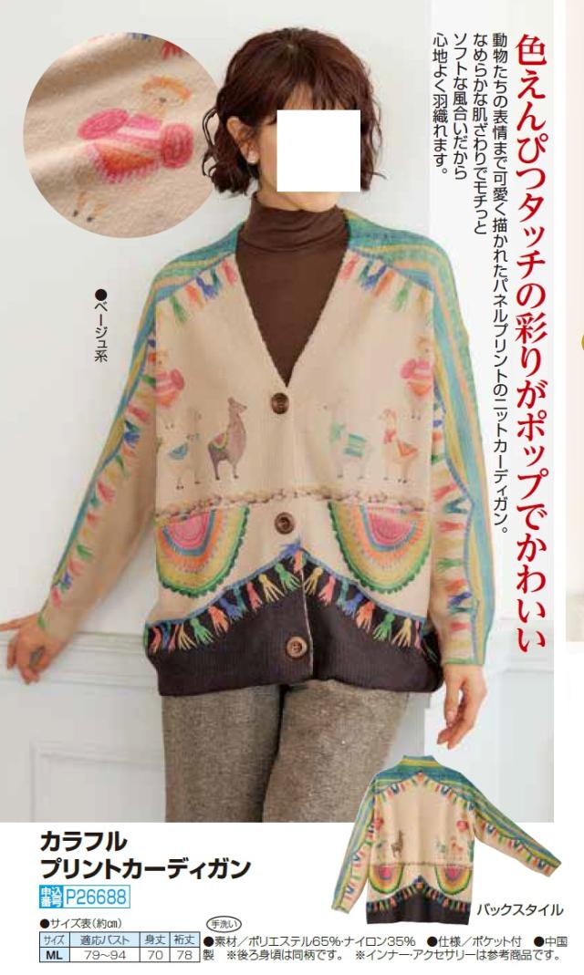カラフルプリントカーディガン ベージュ カーディガン Vネック 動物柄 手描き風 レディース 婦人服 ミセス シニア 女性 V首 長袖 かわいい おしゃれ 個性的 アニマル柄 シニアファッション 40代 50代 60代 70代 80代 母の日 お母さん おばあちゃん 秋冬 nss p26688