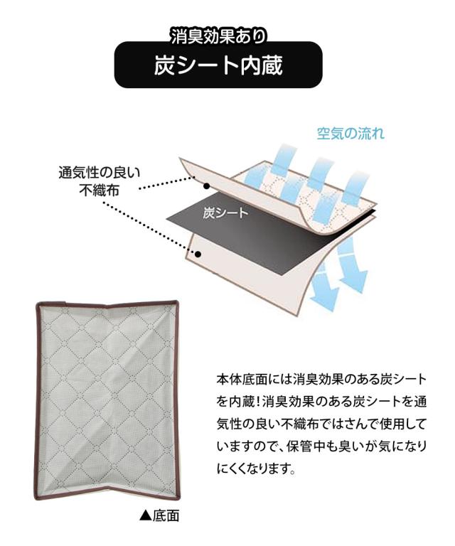 本体底面には消臭効果のある炭シートを内蔵!消臭効果のある炭シートを通気性の良い不織布ではさんで使用していますので、保管中も臭いが気になりにくくなります。