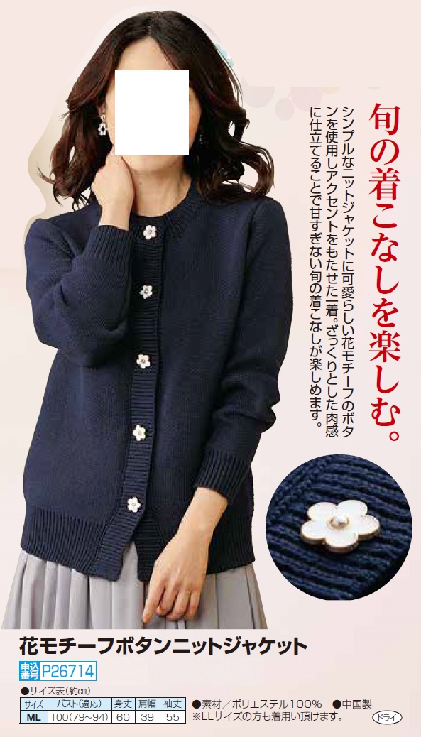 花モチーフボタンニットジャケット ネイビー カーディガン ジャケット 紺色 レディース 婦人服 ミセス シニア 女性 長袖 フラワー ボタン デザイン フェミニン 大人かわいい シンプル シニアファッション 40代 50代 60代 70代 80代 母の日 お母さん 秋冬 nss p26714