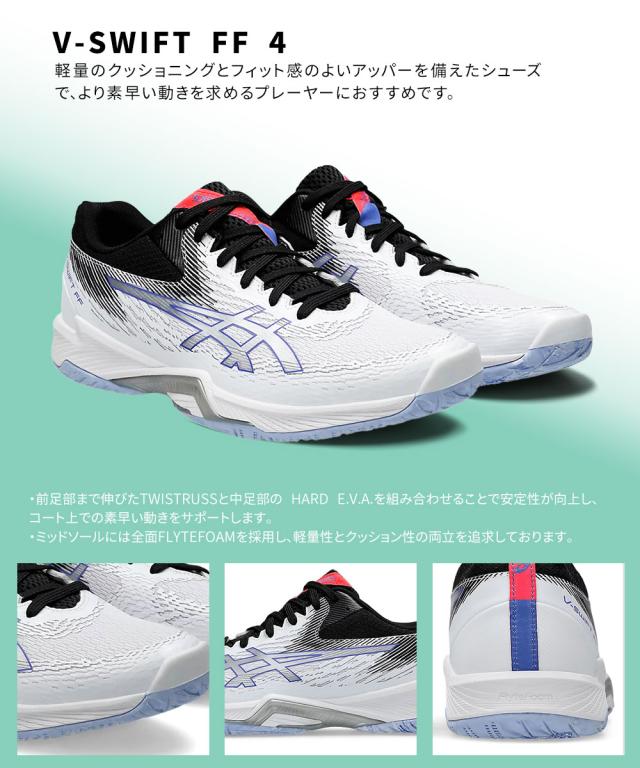 V-SWIFT FF 4は、軽量のクッショニングとフィット感のよいアッパーを備えたシューズで、より素早い動きを求めるプレーヤーにおすすめです。