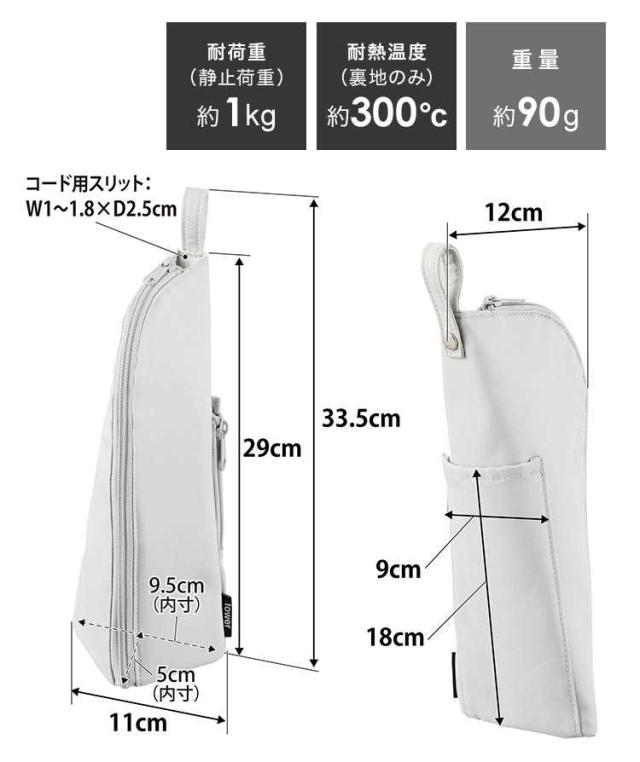 【耐熱ヘアーアイロンポーチM】 ヘアーアイロンを熱いまま収納できる!吊り下げても置いても出し入れ簡単な耐熱ヘアーアイロンポーチ。吊るして浮かせることで洗面所もスッキリ。ストラップはボタン開閉式なのでタオルバーなどにも吊り下げられます。 ■ブランド名 tower / タワー ■JAN 4903208013819/4903208013826 ■品番 1381/1382 ■サイズ 本体:H33.5×W11×D12cm(ストラップ含む) 本体:H29×W11×D12cm(ストラップ含まず) ■内寸 底面:W9.5×D5cm コード用スリット:W1〜1.8×D2.5cm ストラップ内周:13cm ポケット:H18×W9cm ■重量 約90g ■素材 表地:ポリエステル 裏地:グラスファイバー ■耐荷重 1kg(静止荷重) ■耐熱温度 300℃(裏地のみ) ■対応するヘアーアイロン ストレートアイロン(ミニアイロン) ※ヘアーアイロンのサイズや形状によっては収納できない物もあります。 ■生産国 中国 ■ご注意 ※縫製品のため、サイズに若干の個体差が生じることがあります。 レビュー商品の評価: お店の情報お店の評価: 連絡・応対 - 配送スピード - 梱包 - 注目の特集 | |||||||||||||||||