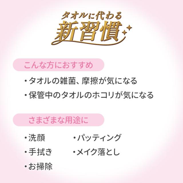 便利と清潔さの一体感で、いつものスキンケアをより快適に洗顔・パッティング・メイク落とし・手拭き・お掃除などさまざまな用途でご使用いただけます。