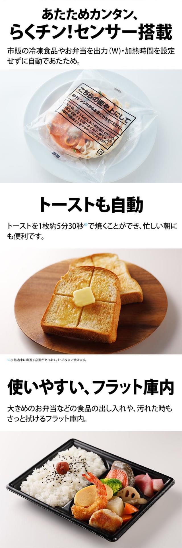 ワット数(出力)・時間設定なしで仕上がりを見極め、市販の冷凍食品やお弁当をかしこくあたためます。