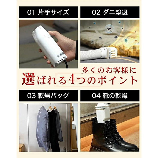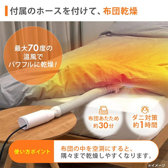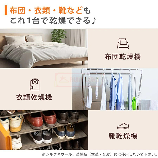 | 【一台多役乾燥機】 | ◆冬場は布団を温めるほか、梅雨時には布団を乾かすほか、部屋干しの洗濯物を乾かすのにも使えます。寝る前に温めておいた布団もふかふかで、気持ちよさそうに眠っています。「布団」の他に「靴」乾燥も可能で便利な1台3役。スニーカーやブーツ、革靴にも対応。 |