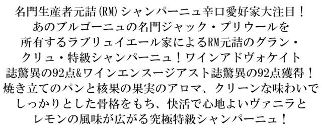 名門生産者元詰(RM)シャンパーニュ辛口愛好家大注目! あのブルゴーニュの名門ジャック・プリウールを 所有するラブリュイエール家によるRM元詰のグラン・ クリュ・特級シャンパーニュ!ワインアドヴォケイト 誌驚異の92点&ワインエンスージアスト誌驚異の92点獲得! 焼き立てのパンと核果の果実のアロマ、クリーンな味わいで しっかりとした骨格をもち、快活で心地よいヴァニラと レモンの風味が広がる究極特級シャンパーニュ!