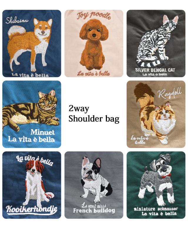 愛嬌のある表情が可愛い犬と猫の刺繍がワンポイントのショルダーバッグ