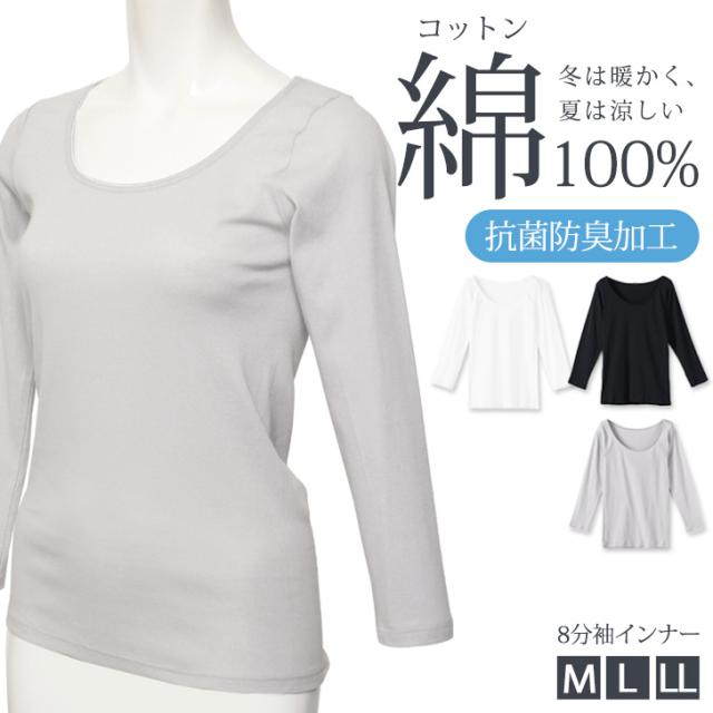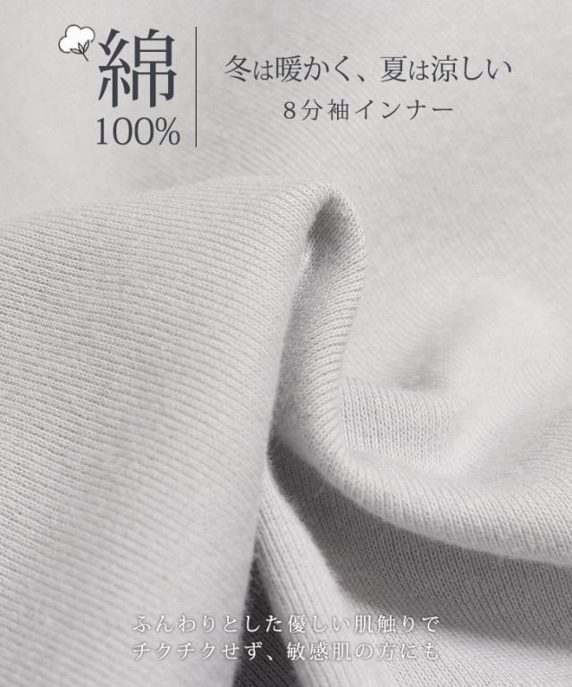 新作 綿100%★抗菌防臭加工ラウンドネック8分袖インナー レディース トップス 肌着 コットン100% 長袖 大きいサイズ あったか 暖かい 涼しい 薄手 通気性 敏感肌 春 秋 冬 無地 シンプル M L LL