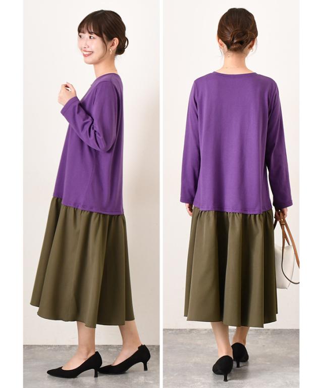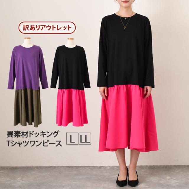 新作 訳あり★異素材ドッキングTシャツワンピース レディース ドレス 秋 冬 春 長袖 きれいめ 上品 フレア Aライン ロング丈 大きいサイズ ゆったり 体型カバー 楽ちん フォーマル 配色 アウトレット 新品